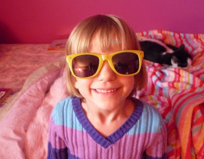 Elizabeth’s class is doing Weather Week, and on one of the days they’re supposed to wear yellow clothes and sunglasses. And what did I find at Target? Yellow sunglasses, 75% off.