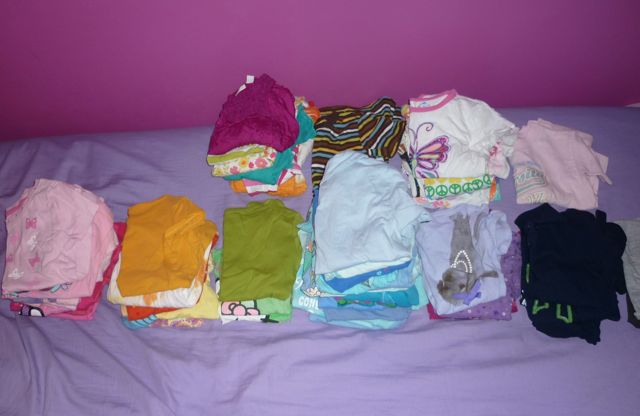 I also got rid of her kindergarten graduation shirt from a year ago, and her camp shirt from this past summer, both of which appear to be men’s size small and go down to her knees like a dress, and also the tie-dye one she made at school that she enjoyed at the time but has never worn since.
