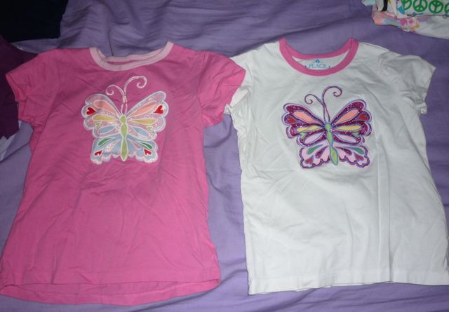 The first thing I noticed was that FIVE of the shirts featured butterflies, so that seemed like a good culling area. We kept one that had an overall pattern of butterflies (as opposed to one big featured butterfly), one that doesn’t really look like a butterfly because it’s made up of words, and two that feature large butterflies but they go with almost all of her skirts and she preferred one and I preferred the other so we kept both.
