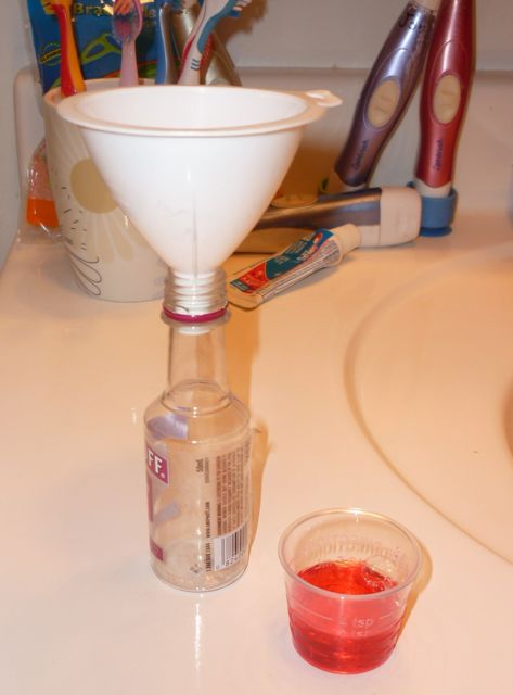 Usually I peel the label off the bottle to make it look less seedy, but this particular label was leaving a ton of sticky residue and I didn’t have time to mess with that so I just left the label on. I have a tiny little funnel that makes it easier to get the medicine into the bottle, but I’ve also just carefully poured it.