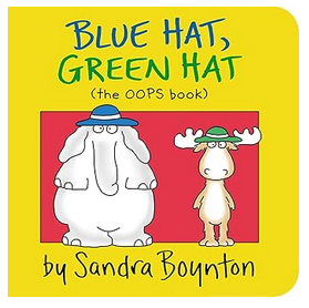 Blue Hat, Green Hat, by Sandra Boynton. Silly, fun to read. I wish it didn’t now say “(the OOPS book)”. We don’t need to point out the joke. I have also ordered But Not the Hippopotamus by the same author.